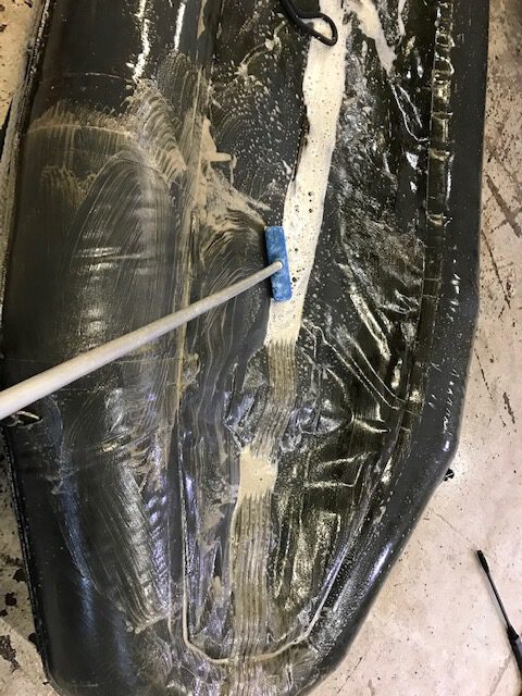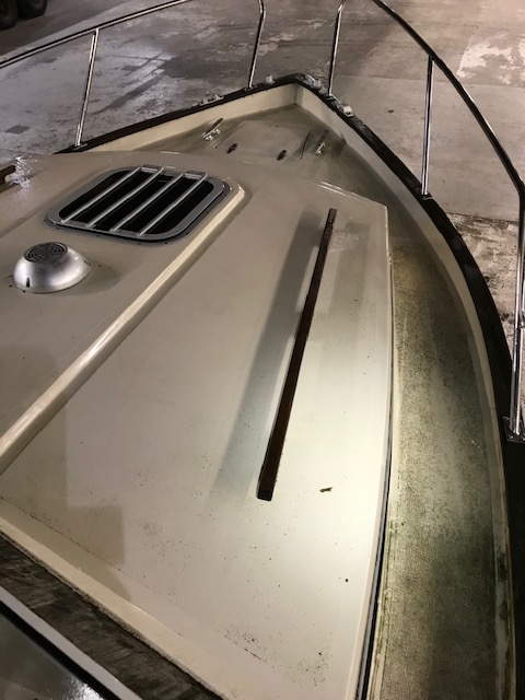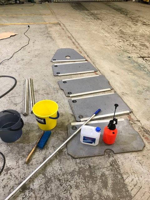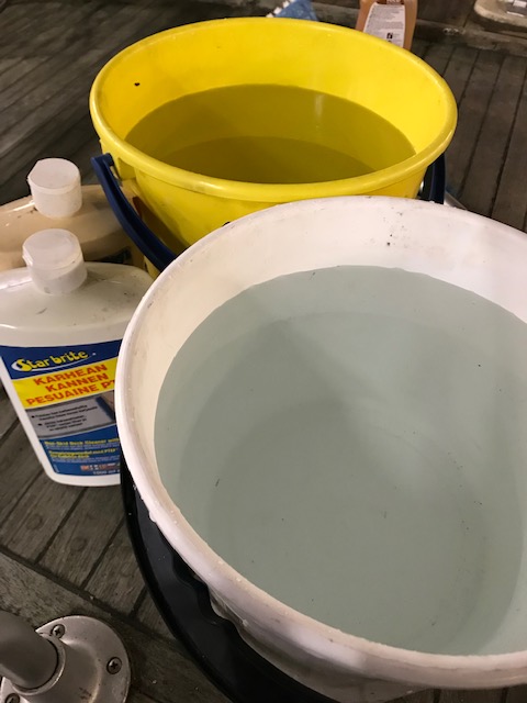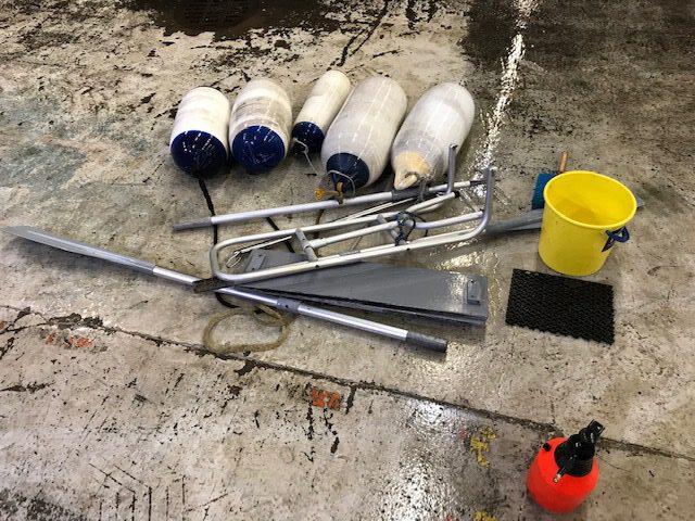Köysien pesun aloitin tyhjentämällä kaikki veneen köysilokerot ja muuta säilytystilat. Uimatasolla on kaksi suurta köysilokeroa ja keulassa yksi. Samalla löytyi pari poijuhakaa, kaksi Bruce-tyyppistä ankkuria, kaksi naara-ankkuria, kalliokiiloja ja muita kiinnitystarvikkeita. Osa ankkuroinnissa käytetyistä sakkeleista oli ollut sinkittyjä ja ne olivat syöpyneet pahasti. Onneksi ruostumattomia sakkeleita ja muita osia löytyy kattava valikoima muun muassa Biltemasta.