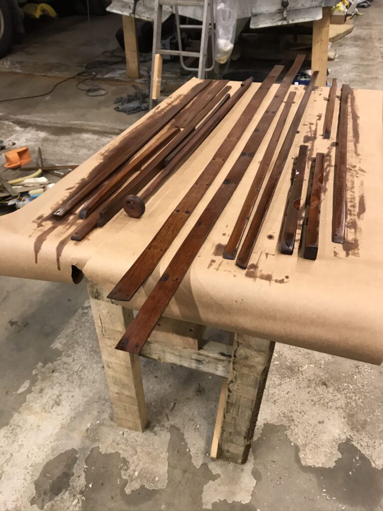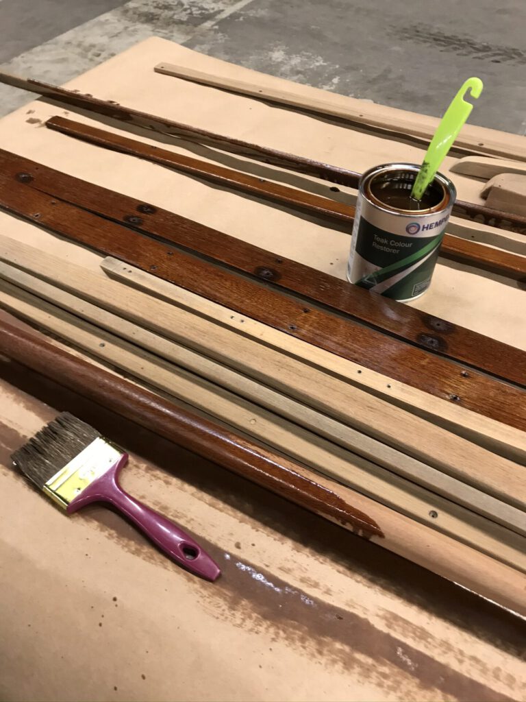 Tiikkiosat hiottiin ja ne käsiteltiin Hempel Teak Color Restourer:lla ja Teak Oil:lla. Todella kuivista teak osista tuli uuden veroiset. Tiikin kulumista voi ehkäistä siten, että hionnan asemesta käsittelee tiikit mieluummin Hempel Teak Cleanerilla. Sillä saa ihmeitä aikaan. Monen mielestä paras tiikki on harmaantunut tiikki, mutta mielestäni Tristan 870 sopii hienosti myös ruskeaksi sävytetty tiikki. Valinta on kapteenin.
