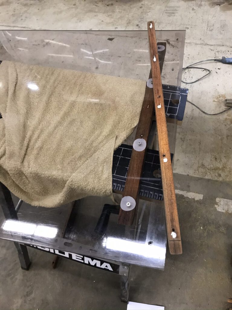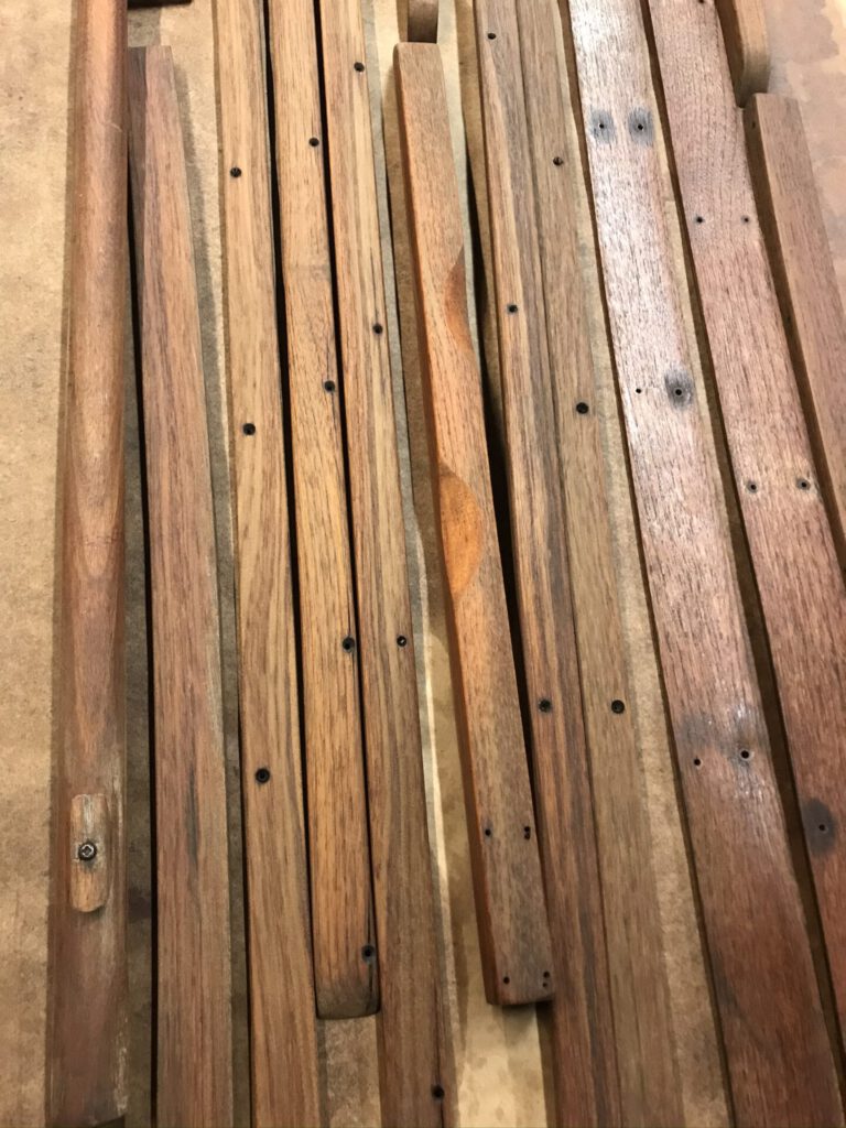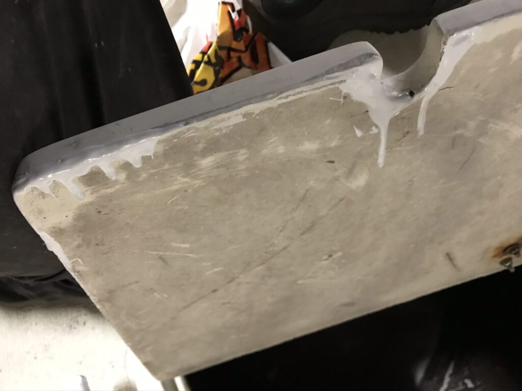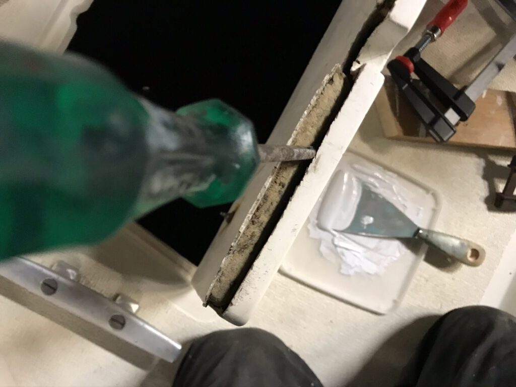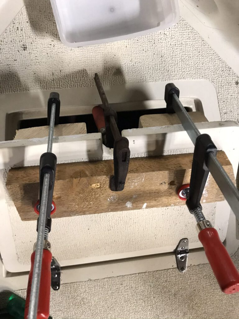 Keulan köysipoksin kansi irvisti. Korjasin kannen siten, että sekoitin epoksista massan, jonka työnsin kannen sauman väliin. Raotin kannen saumaa meisselillä, jotta epoksia saa mahdollisimman hyvin liitokseen. Puristin kannen kasaan puristimilla ja epoksin kuivuttua hioin sauman siistiksi. Kosteutta epoksoitavissa kappaleissa ei saa olla, joten kuivatus on tärkeää, jotta työ onnistuu hyvin.