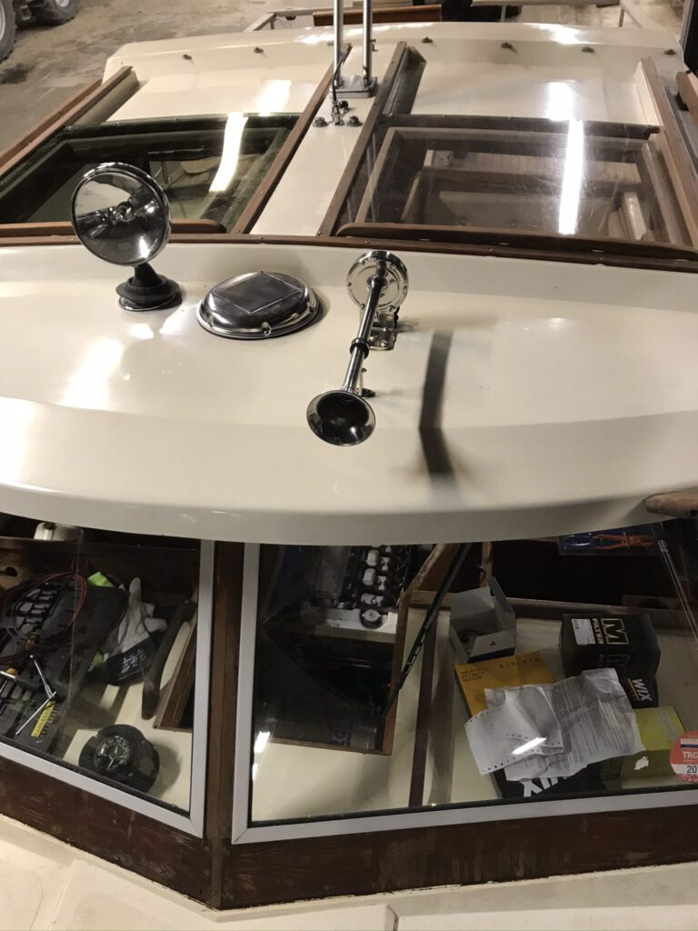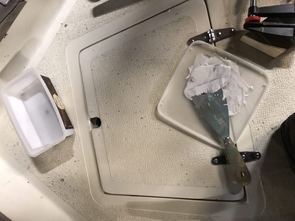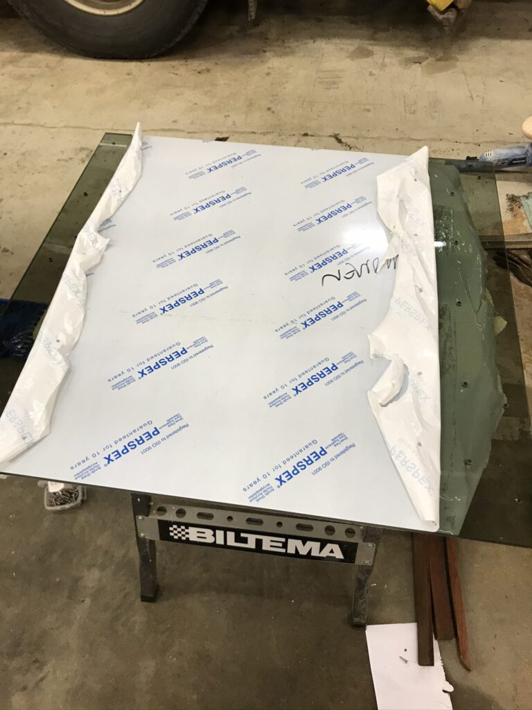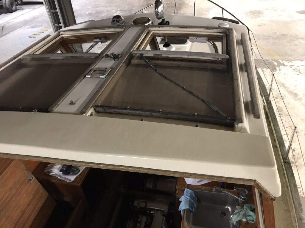 Toinen kattoluukku oli halki ja toinen naarmuuntunut sameaksi. Poistin luukut ja purin tiikkilistat pois. Mittasin vanhan kattoluukun ja tilasin Vink Finlandilta uuden muovilevyn kattoluukuksi. Vanhassa luukussa reiät osuivat aivan levyn reunaan, joten uuden levyn tilasin hieman pidempänä. Porasin reiät vanhaa kattoluukkua hyväksi käyttäen. Toisen, ehjän kattoluukun kiillotin.