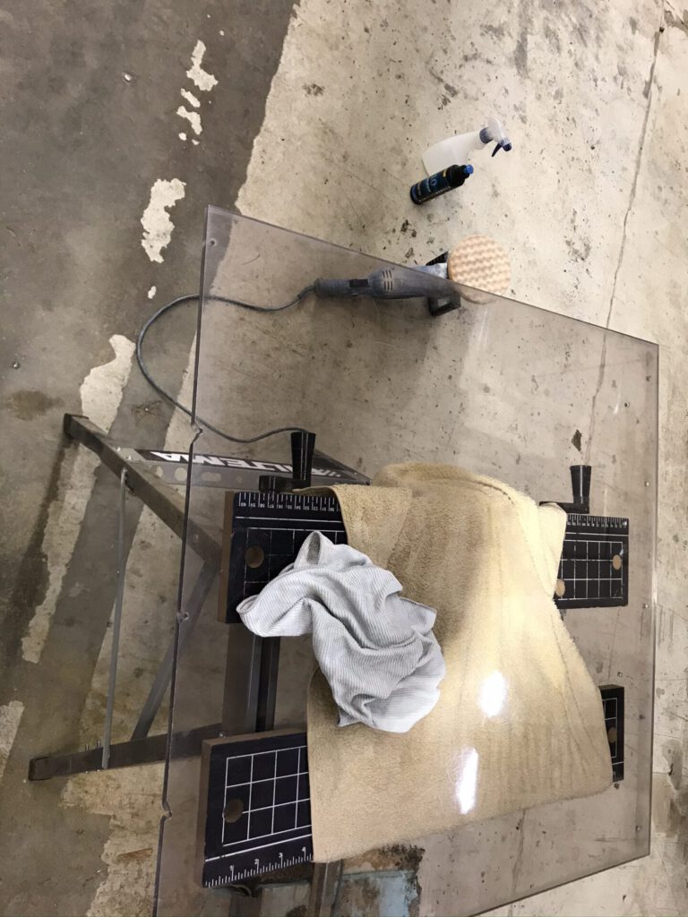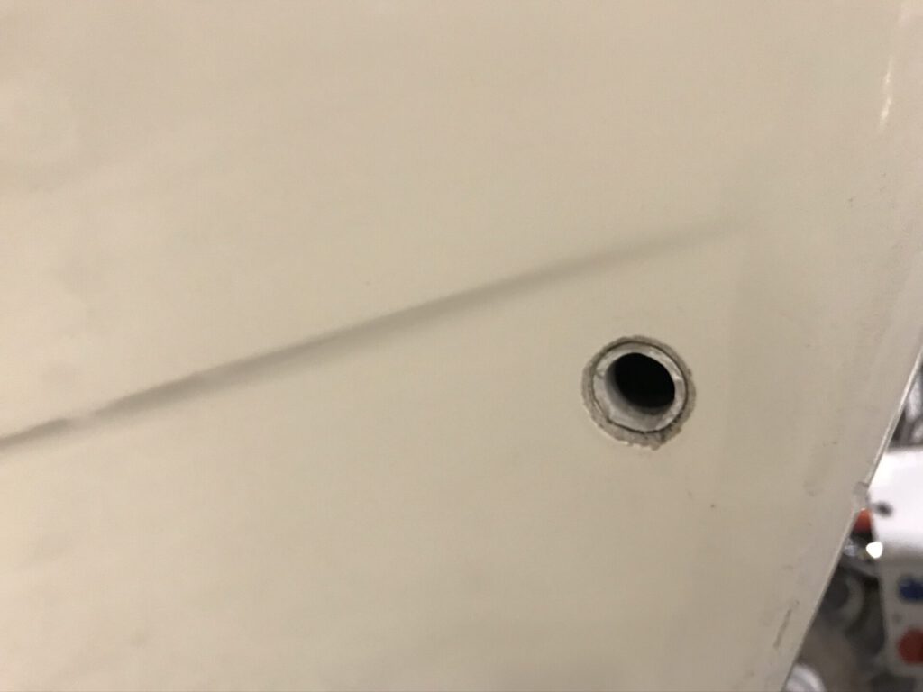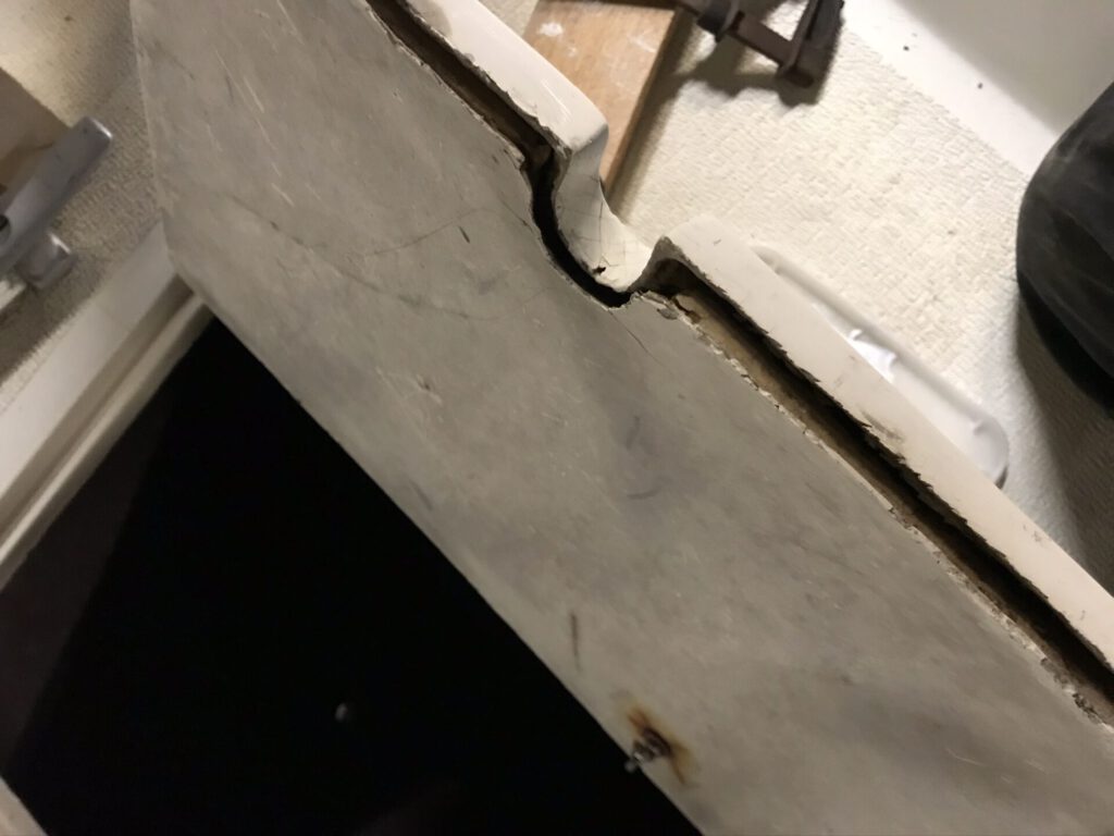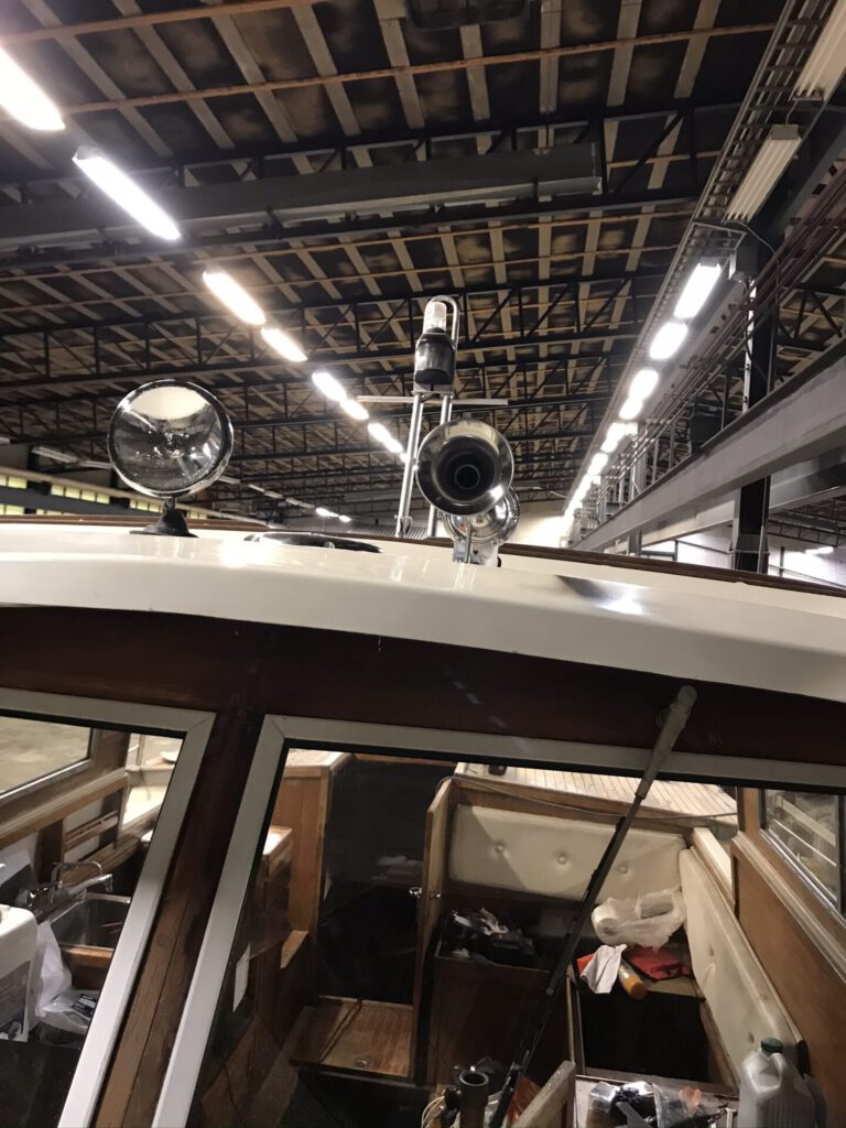 Toinen kattoluukku oli halki ja toinen naarmuuntunut sameaksi. Poistin luukut ja purin tiikkilistat pois. Mittasin vanhan kattoluukun ja tilasin Vink Finlandilta uuden muovilevyn kattoluukuksi. Vanhassa luukussa reiät osuivat aivan levyn reunaan, joten uuden levyn tilasin hieman pidempänä. Porasin reiät vanhaa kattoluukkua hyväksi käyttäen. Toisen, ehjän kattoluukun kiillotin.