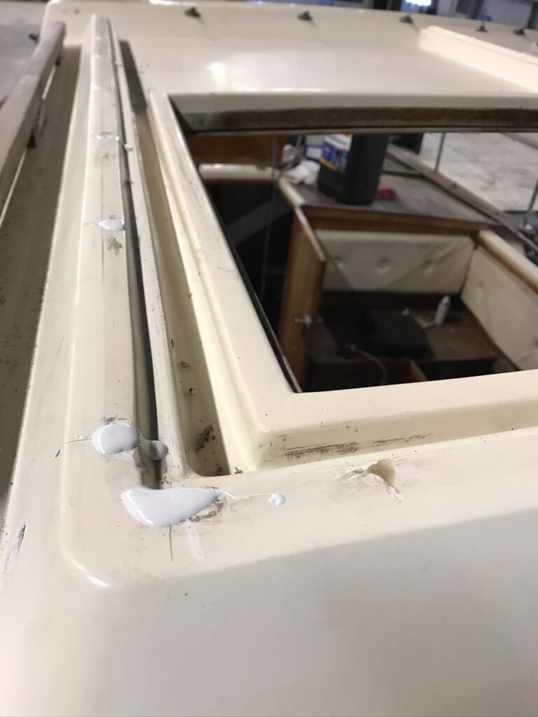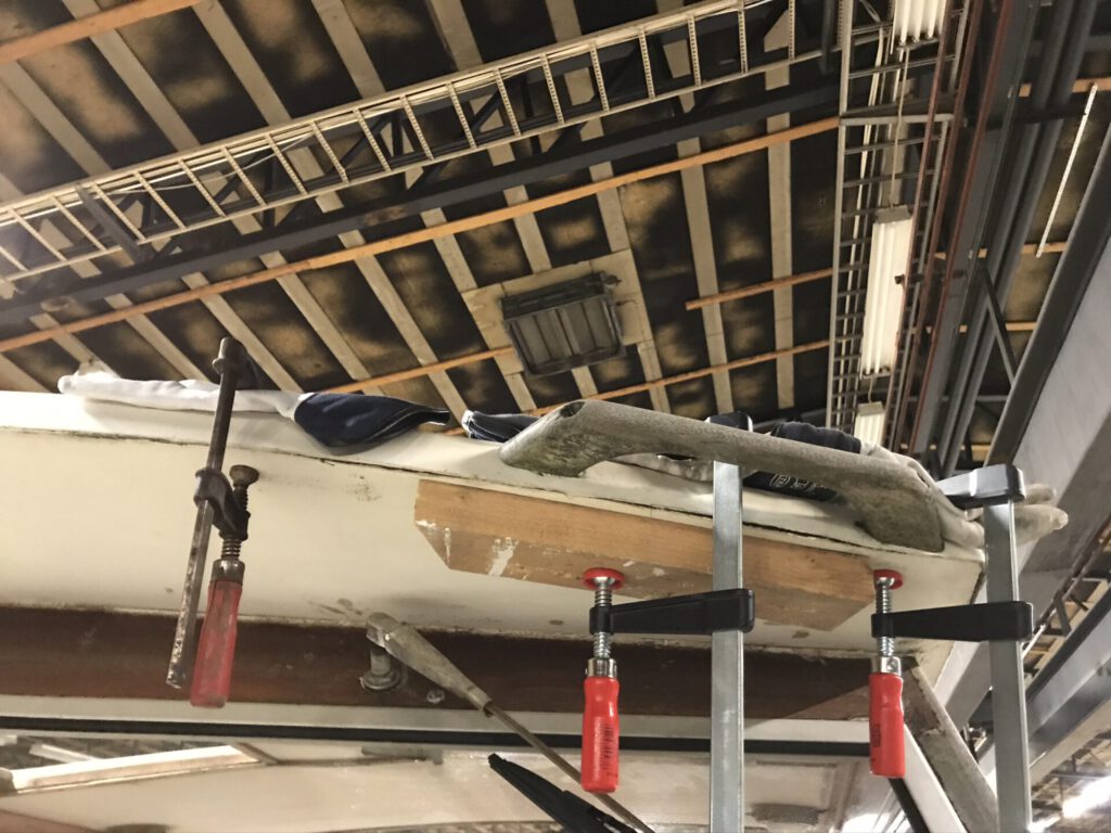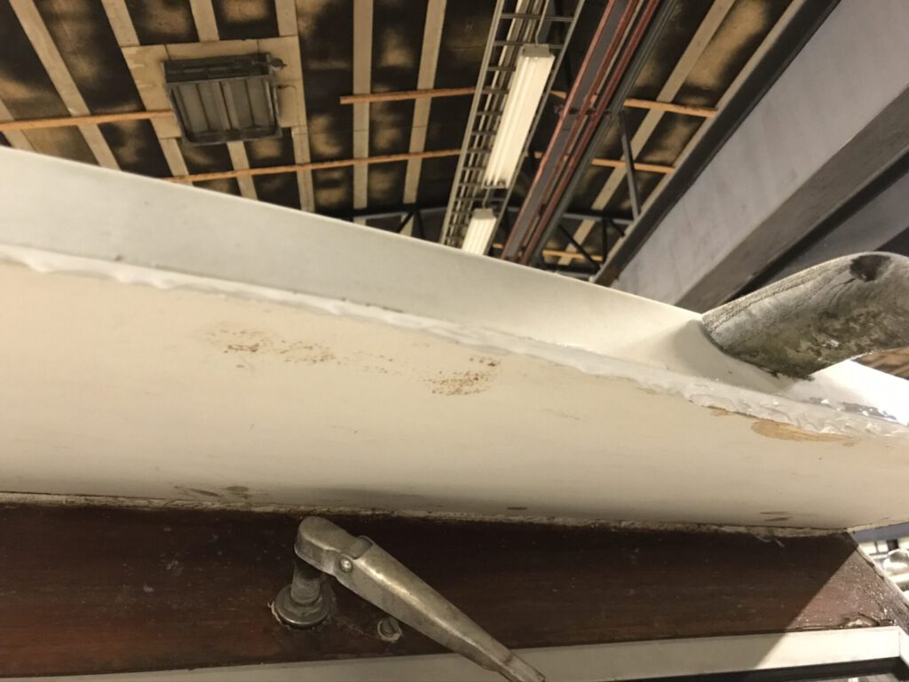 Katon lippa irvisti kulmastaan. Puhdistin liitoksen, levitin saumaa ja työnsin sinne epoksia liimaksi. Puristin liitoksen kiinni puristimilla. Epoksi kuivettua hioin ylipursunneen epoksin pois. Samalla kun epoksia oli käsillä, täytin kattoluukun rimoituksen väljistyneet reiät epoksilla.