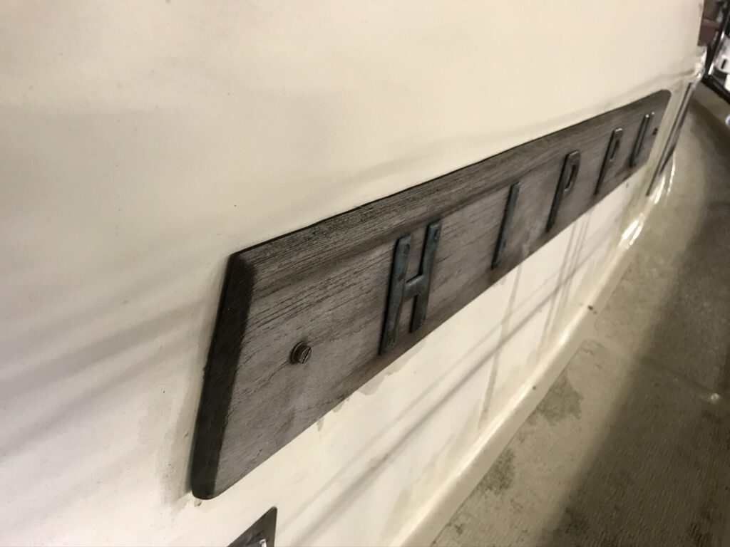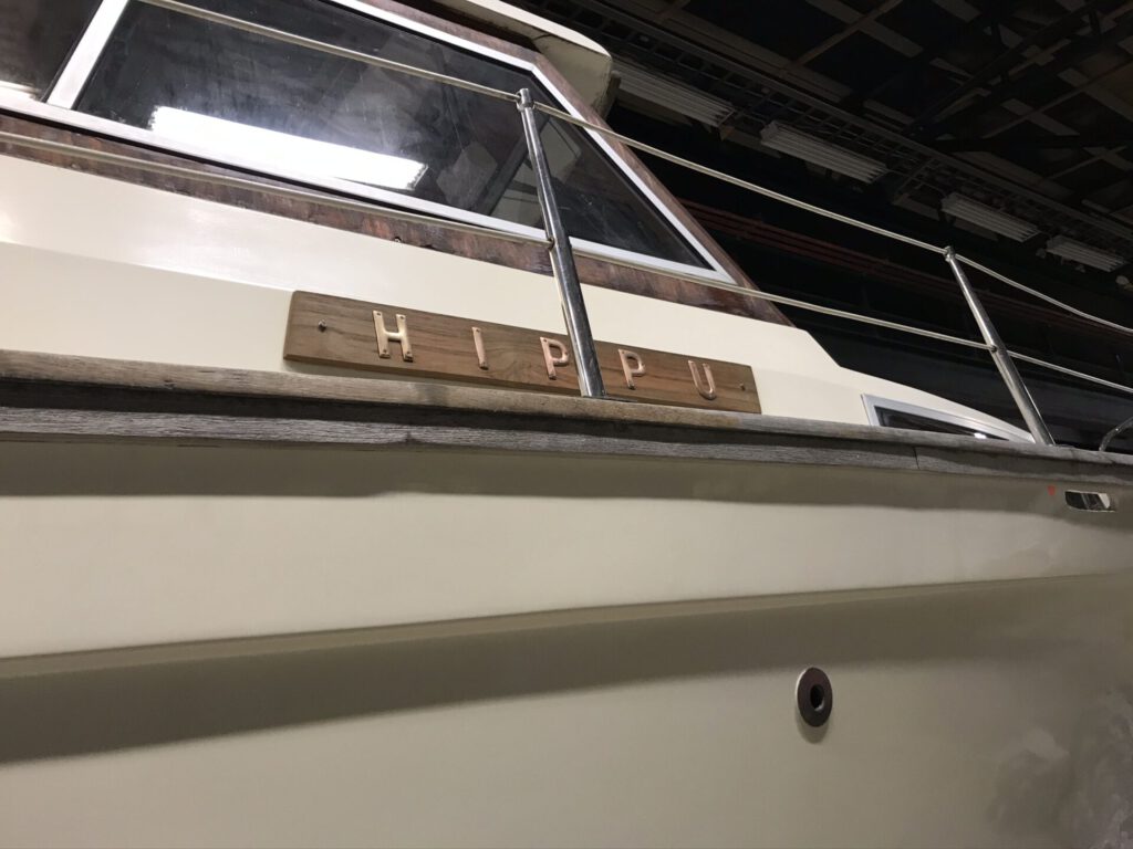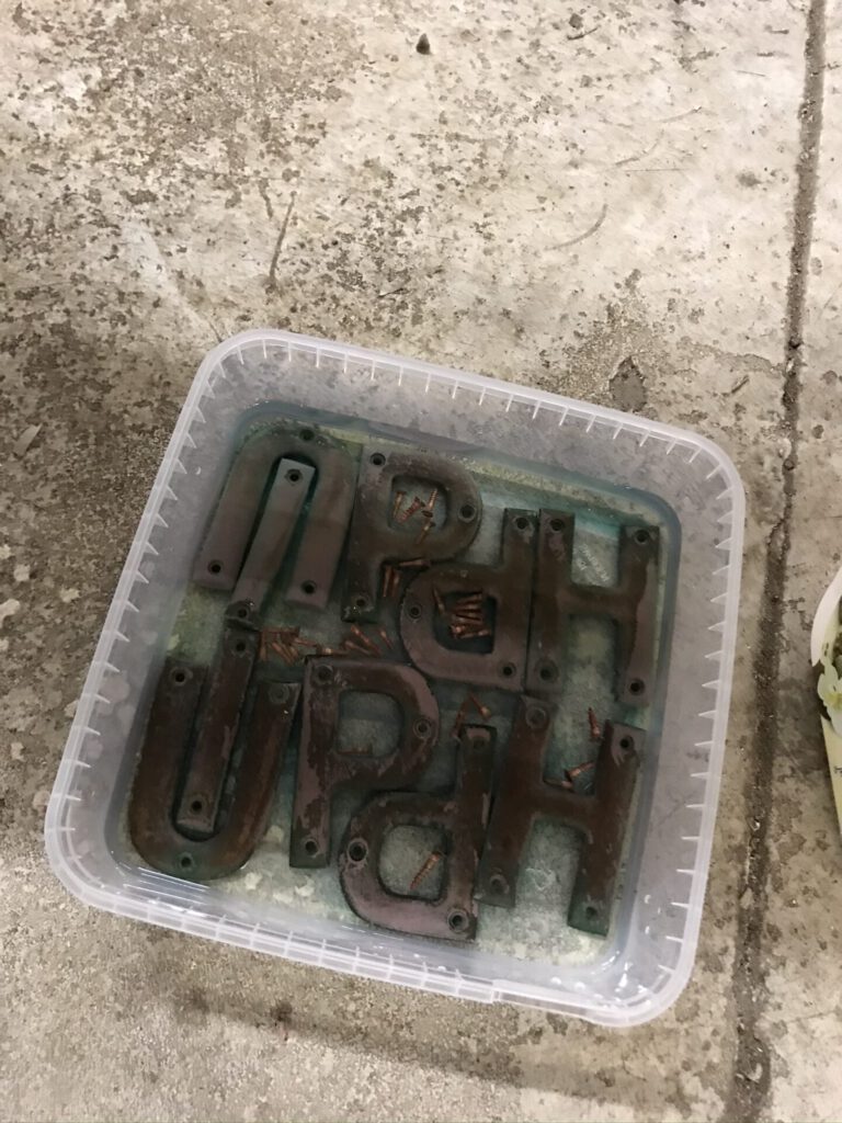 Virttyneiden nimikylttien kunnostuksen aloitin irrottamalla kyltit ja niissä olevat kirjaimet. Liotin kirjaimia sitruunahapossa. Hioin ja öljysin nimikyltin taustalaudan ja kiinnitin kupariset kirjaimet takaisin. Valitettavasti vanha hieno patina hävisi osittain kirjaimista, mutta uusi syntyy pian.