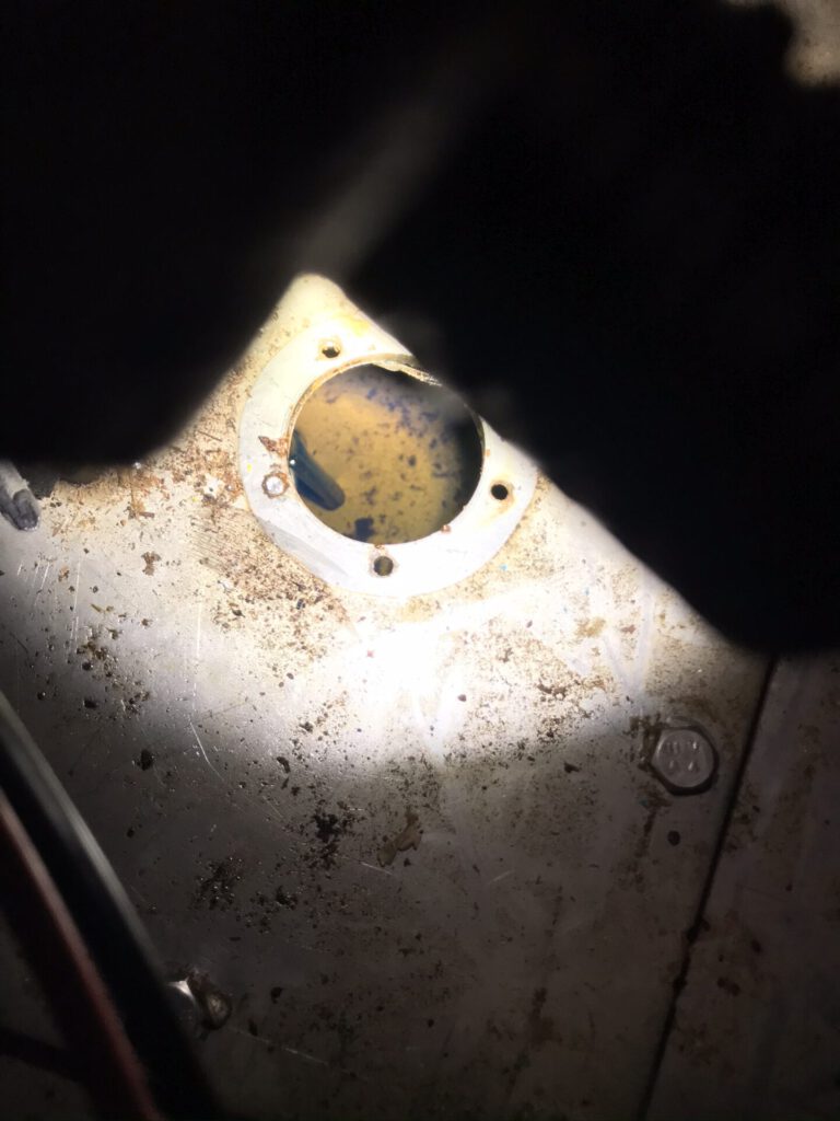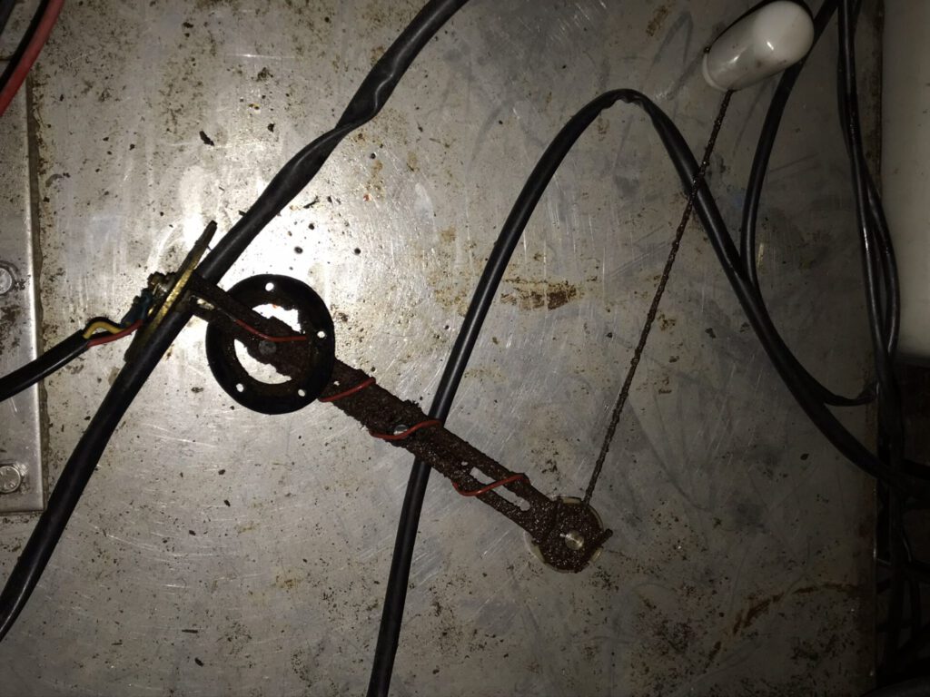 Kurkistin tankkiin ja tein bakteeriviljelytestin. Dieselbakteeria ei ollut, pieniä roskalauttoja oli tankin pohjalla, joten varasin varaosiksi riittävän määrän varasuodattimia (karkea ja hieno). Polttoainemittari ei näyttänyt oikein, joten mittasin siitä Ω arvot yleismittarilla, näytti 0-180 eli oikein. Lisäsin anturiin uuden Bilteman polttoainemittari, mutta sekään ei näytä oikein. Luultavasti koho takertelee. Ensi kaudeksi pitää uusia anturi. Vanhan anturin runko on paksun ruosteen peitossa.