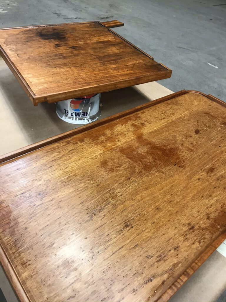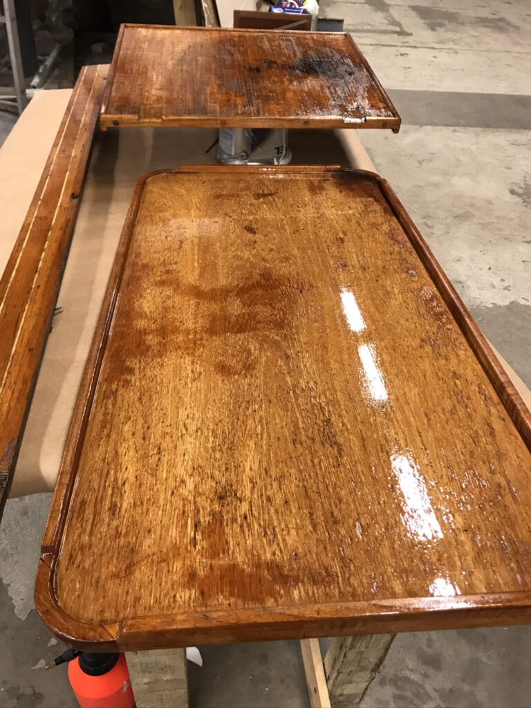 Lakattavista kappaleista siklattiin irtoava lakka pois ja hiottiin pinta. Tiikin rasvaisuus vaatii myös rasvanpoistoaineen käytön. Sen jälkeen kiiltävää Hempelin Dura-Gloss Varnishia pintaan noin 7 kerrosta, ensimmäiset kerrokset ohentaen ja päälle satiini lakkaa yksi kerros . Lopputulos on juuri niin hyvä kuin tehty pohjatyö ennen lakkausta. Pölyttömyys on tärkeää.